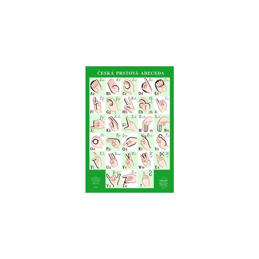 Oboustranná výuková tabule pro nácvik prstové abecedy. Na jedné straně jsou abecedně seřazeny všechny znaky prstové abecedy, doplněné písmeny české abecedy. Druhá strana tabule slouží k procvičování, znaky prstové abecedy jsou uvedeny na přeskáčku, úkolem je dopsat ke znaku správné písmeno české abecedy.