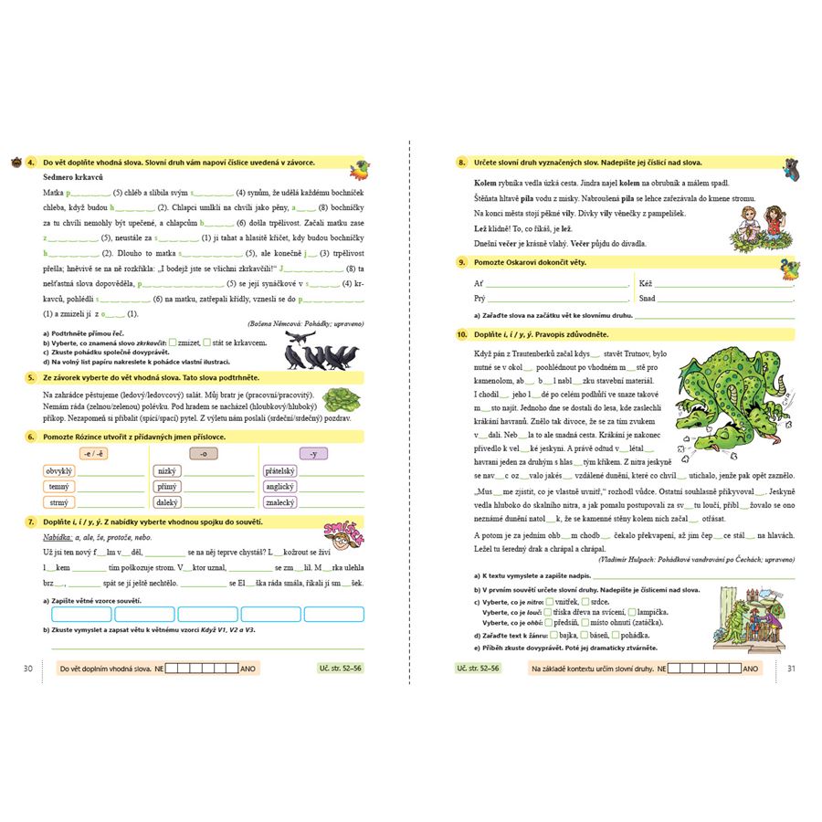 Čím se vyznačují nová plněbarevná vydání Český jazyk 5:• navazují na učební materiály pro 4. ročník: Český jazyk 4 (učebnice), Český jazyk 4, 1. a 2. díl (barevné pracovní sešity)• doplňují se s pracovními učebnicemi Jsem čtenář 1, Jsem čtenář 2 a Jsem čtenář 3• mají moderní a přehledný vzhled se smysluplným využitím plné barevnosti• obsahují různorodá cvičení systematicky směřující k osvojení učiva i souvisejících dovedností• přinášejí pozvolný nárůst obtížnosti (úlohy nejprve jednodušší svým obsahem i formulací zadání)