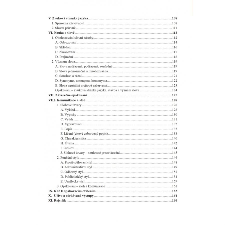 Učebnice je zpracována přehledně a srozumitelně, obsahuje témata tradičně řazená do 9. ročníku: úvodní výklad o jazyce, nauka o slově a?slovní zásobě, procvičení pravopisu, tvarosloví, skladba a sloh, média a mediální výchova. Nachází se zde také závěrečné opakování a klíč s řešení opakovacích testů. Přínosem učebnice je, že obsahuje i mezioborově propojené texty podporující a testující čtenářskou gramotnost žáků. Zařazeny jsou i uspořádací úlohy, v nichž je cílem určit správné pořadí jednotlivých úseků tak, aby byla dosažena správná textová návaznost (obdobné úlohy jsou součástí přijímacích zkoušek na střední školy).