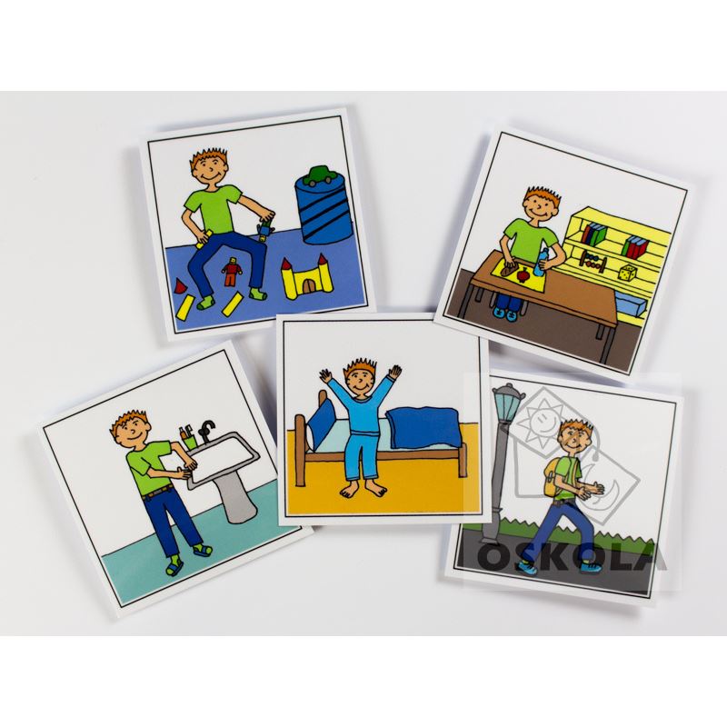 Jedná se o soubor 12ti kartiček, na kterých je zobrazeno, co dělá chlapec po celý den.