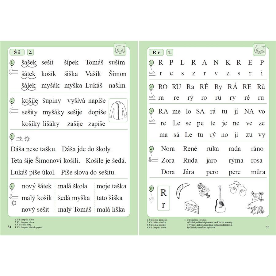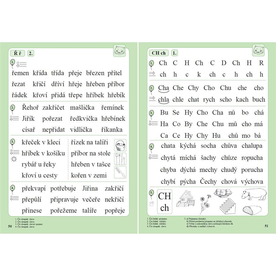 Obsahuje i nácvik čtení slovních spojení, zejména slov s předložkou a dále čtení vět.