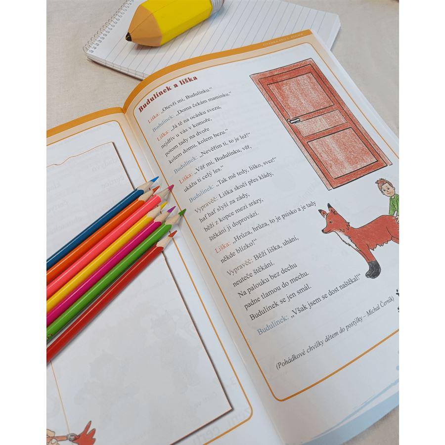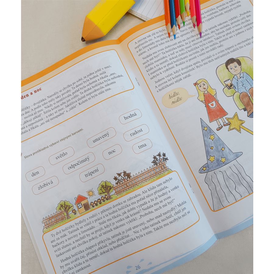 Výukové texty doprovázejí barevné ilustrace s množstvím detailů, které rozvíjí představivost žáků a pomohou s dalším rozvojem grafomotoriky a jejich logického myšlení