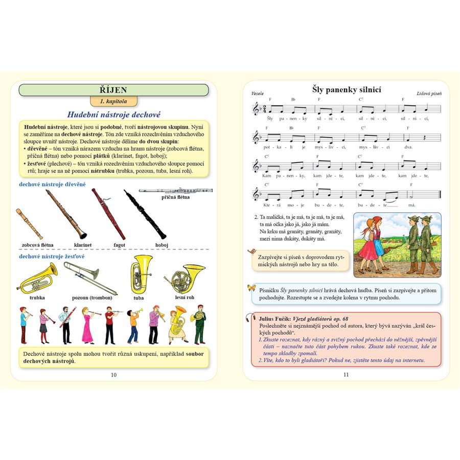 V učebnici najdete i dechová, hlasová a artikulační cvičení, která by se měla stát nezbytnou součástí každé hodiny hudební výchovy. Pro větší přehlednost je učivo rozděleno do jednotlivých měsíců a dále do kapitol. Ty jsou často uvedeny motivačním příběhem, který promlouvá prostřednictvím průvodce učebnicí – slavíka Otíka.