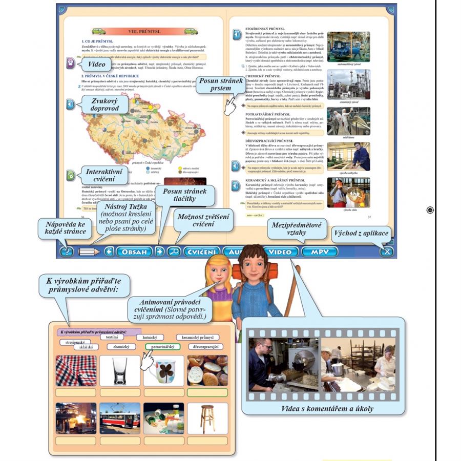 Provázejí animované postavy Vlasty a Vlastíka, kteří odměňuje děti hvězdičkami. Obsahuje: 15 interaktivních cvičení, která se při každém dalším spuštění obměňují; zvukový doprovod; video nahrávky s mluveným doprovodem; fotografie u vybraných témat doplněné o zajímavosti; možnost zvětšení jednotlivých cvičení; pohyblivé geometrické tvary. Snadná navigace a intuitivní přístup. Nástroj tužka.