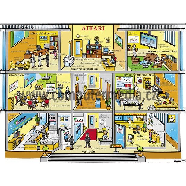 Špičkově ilustrovaný barevný velkoplošný obraz kompletně v italském jazyce, tematicky zaměřený na obchod, reklamu, jednání, bankovní prostředí a poštu. Z pohledu slovní zásoby se jedná o mírně náročnější obraz.