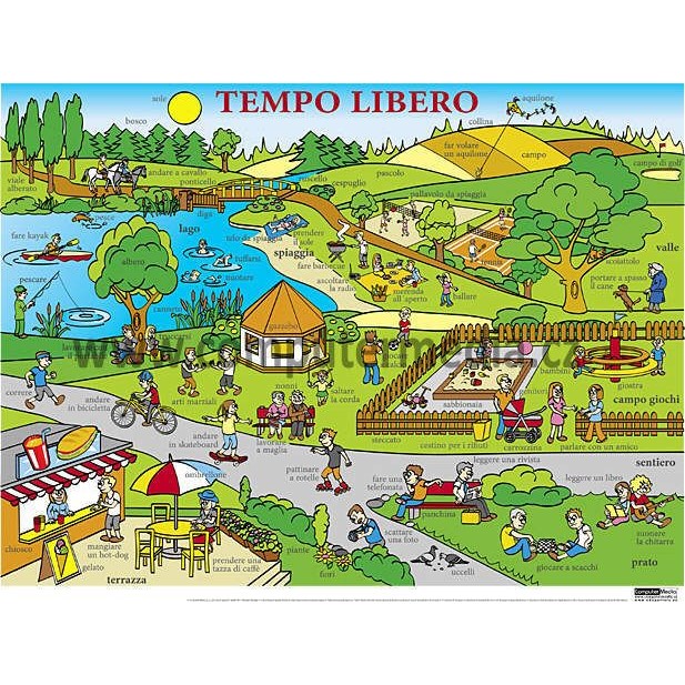 Špičkově ilustrovaný barevný velkoplošný obraz kompletně v italském jazyce, tematicky zaměřený na volný čas a aktivity ve volném čase.