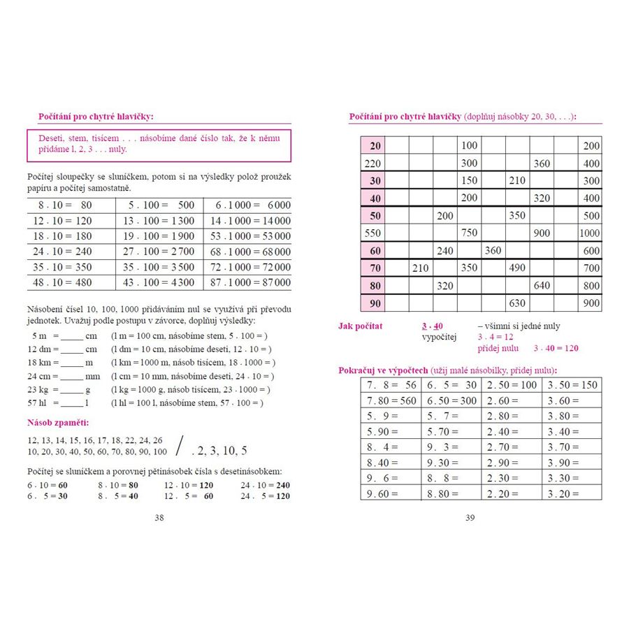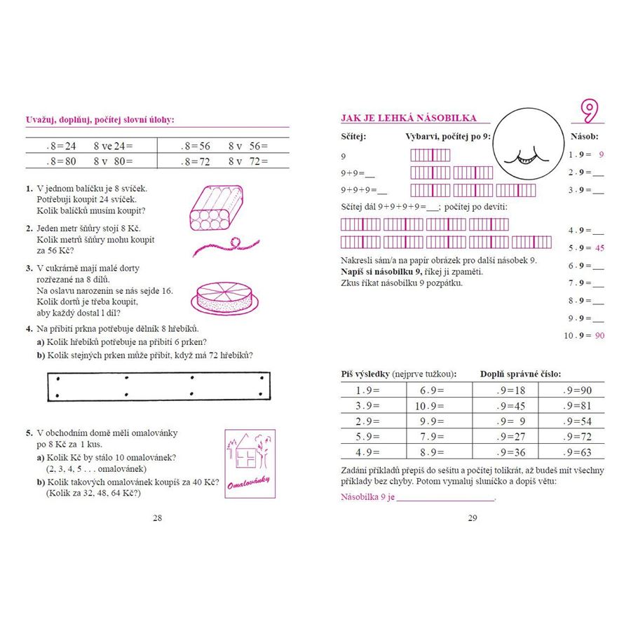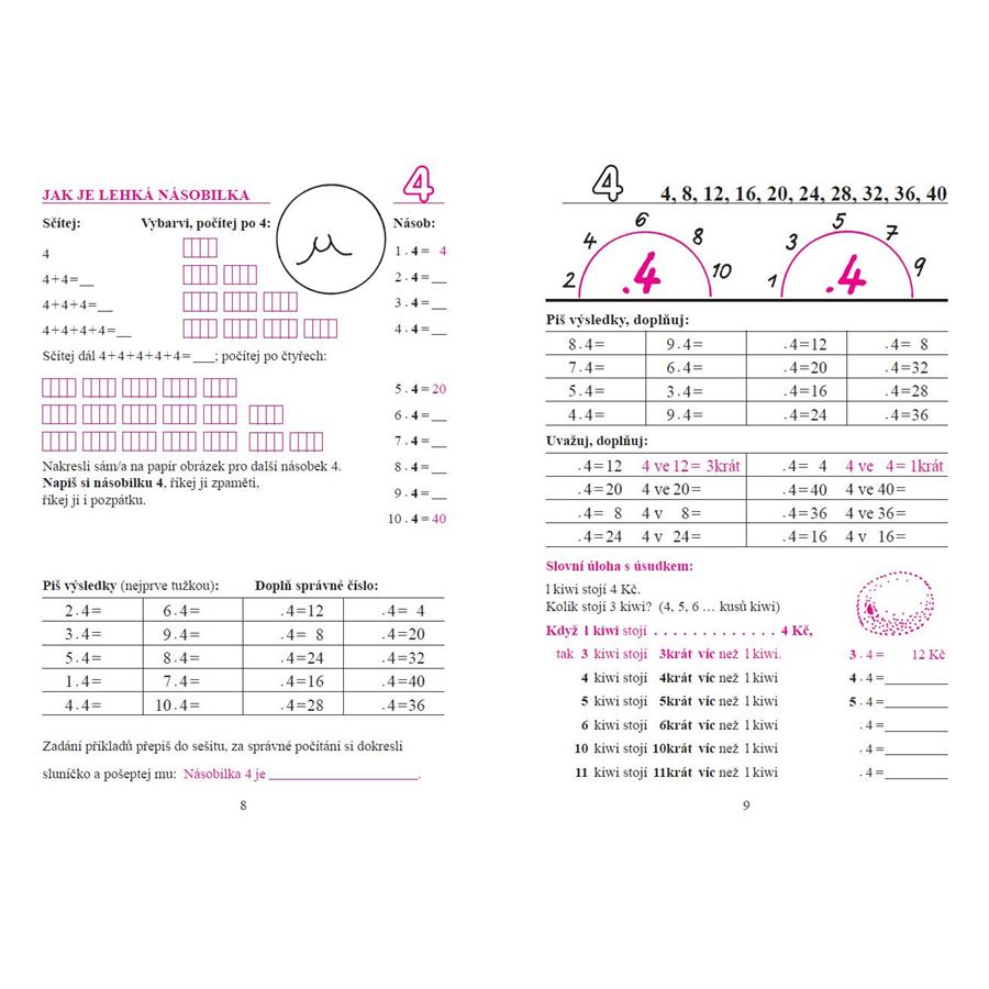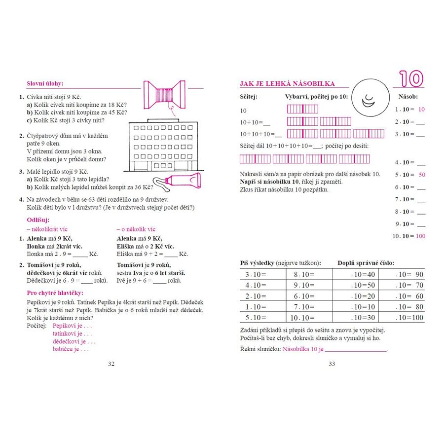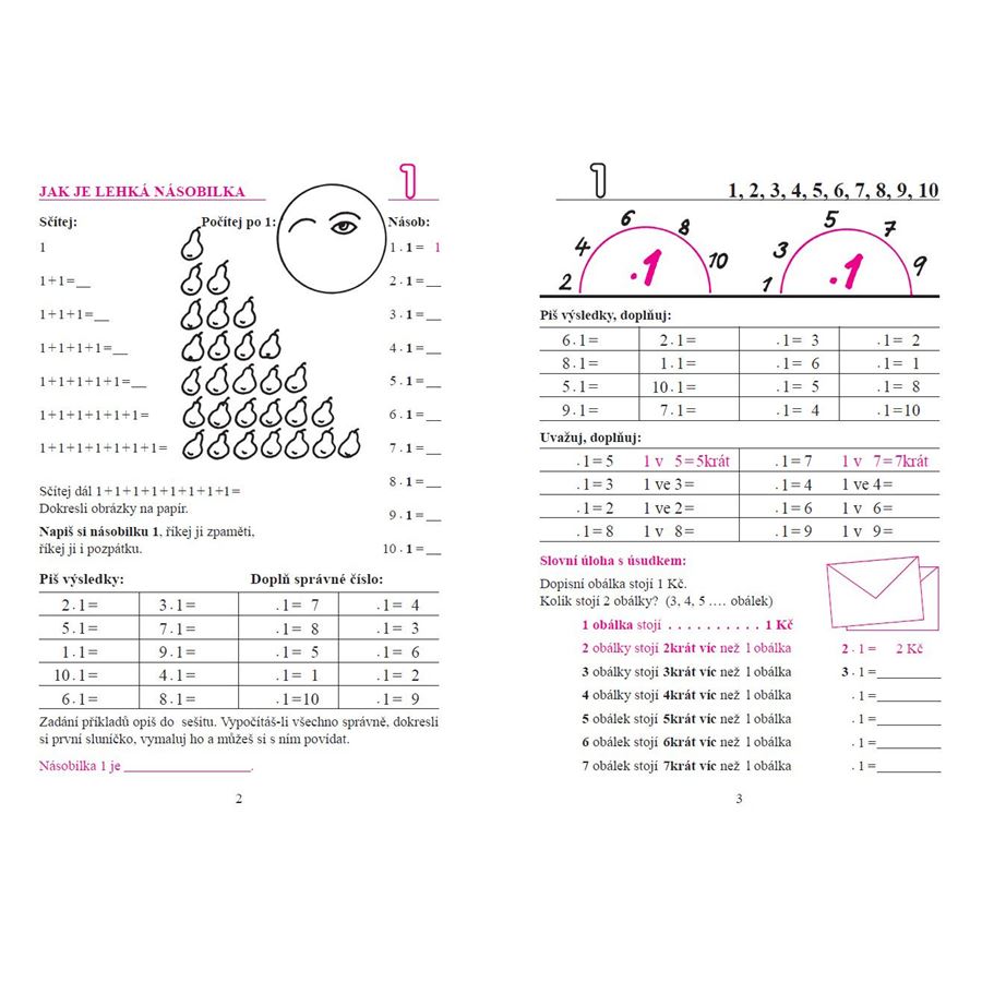 Zahrnuje postupný, názorný nácvik násobilky za pomoci obrázků i náročnější souhrnné příklady. Přináší slovní úlohy s úsudkem „několikrát více“ (i v protikladu s úsudkem „o několik více“).