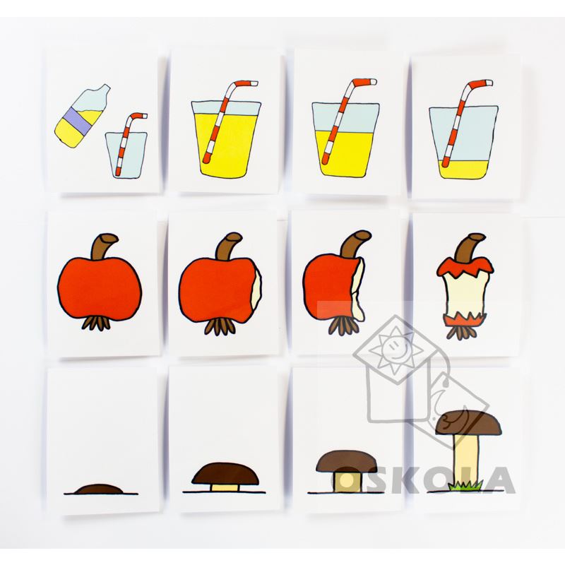 Soubor dějových obrázků obsahuje 10 sad po čtyřech kartičkách. Úkolem je seřadit čtveřici kartiček podle posloupnosti děje.