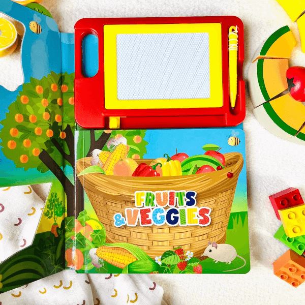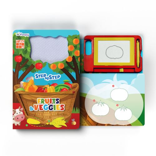 Součástí knihy je magnetická tabulka s perem a obrázkovým návodem s přesným postupem, jak kreslit ovoce i zeleninu. Pero dobře padne do dětské rukojeti a k tabulce je připevněno provázkem, čili nehrozí jeho ztráta a (často zdlouhavé) hledání.