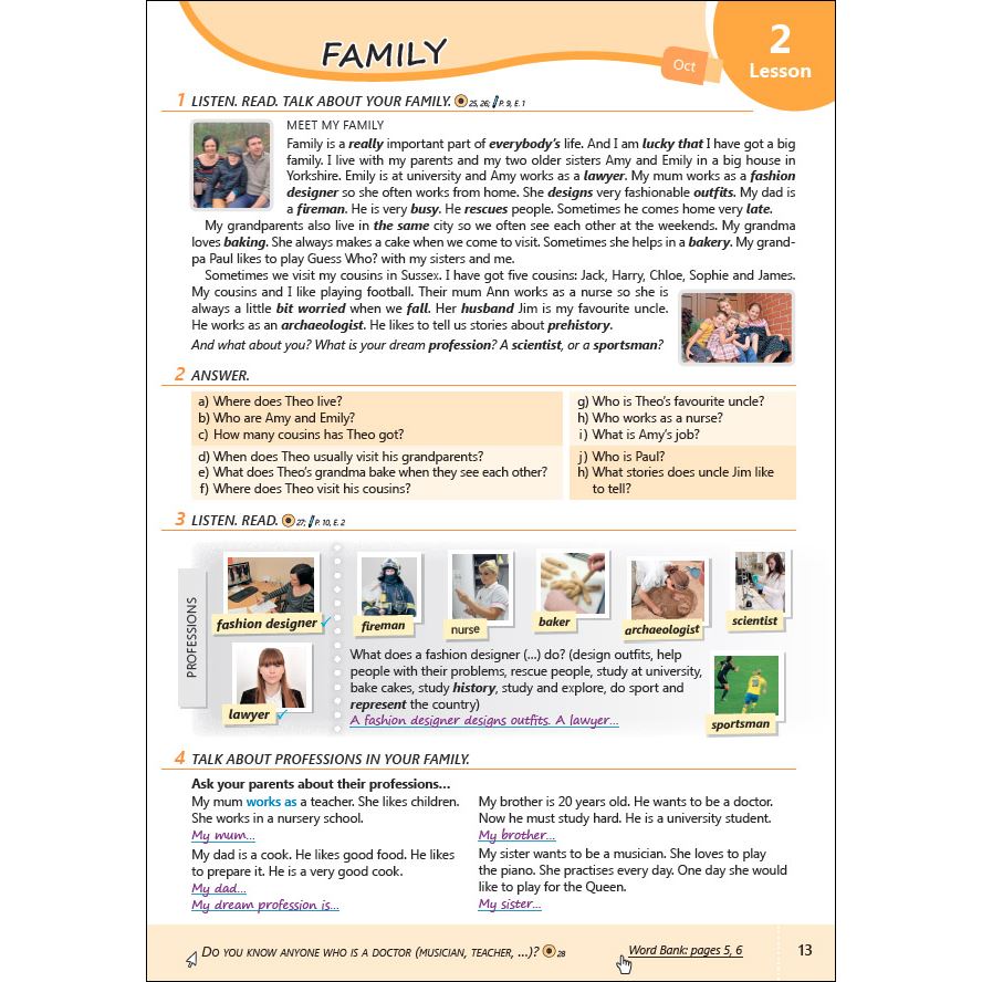 První strana se vždy zaměřuje na čtení s porozuměním textu, žáci se zde zároveň seznámí s novou slovní zásobou. V 1. díle se jedná o témata: In Space, Family, Europe, Christmas, Travelling.