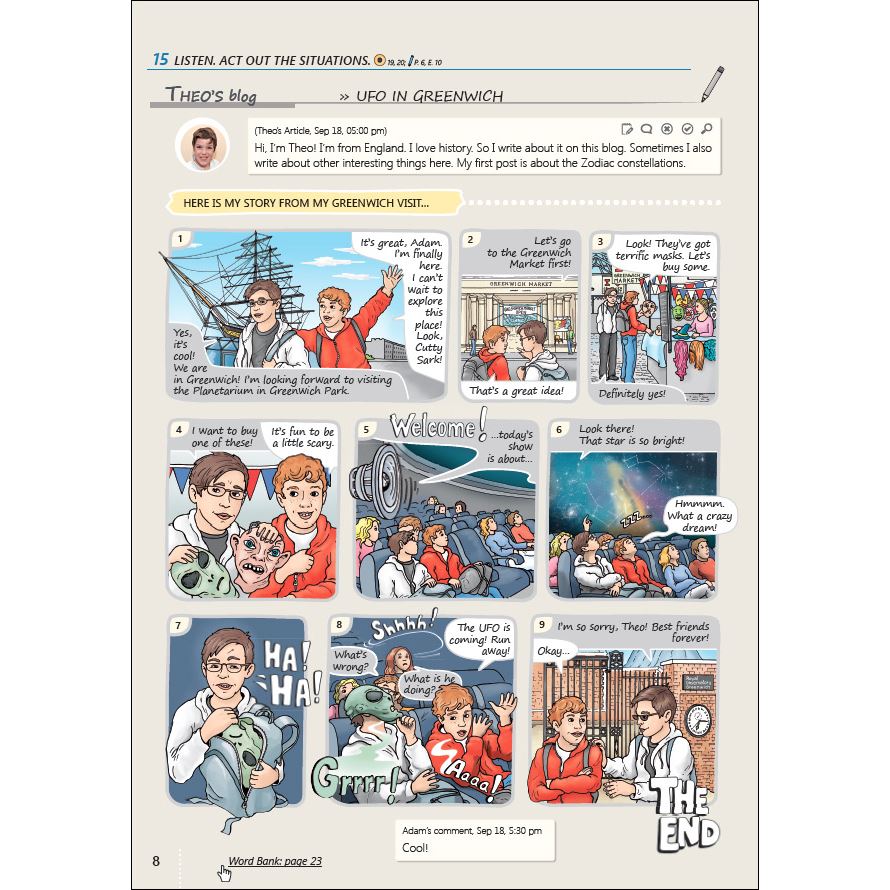 Čtvrtá strana nabízí žákům příběh psaný zábavnou komiksovou formou. Žáci si v rámci probíraného tématu rozšíří své konverzační dovednosti o fráze, které využijí v reálných situačních rozhovorech.