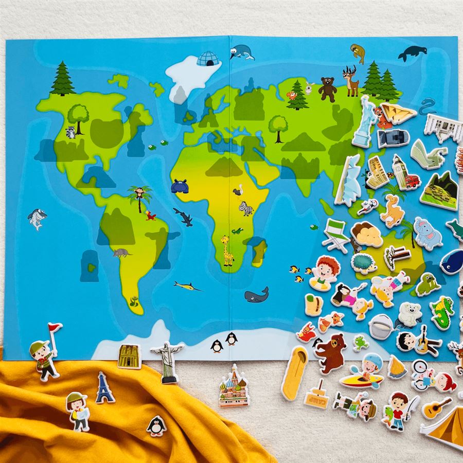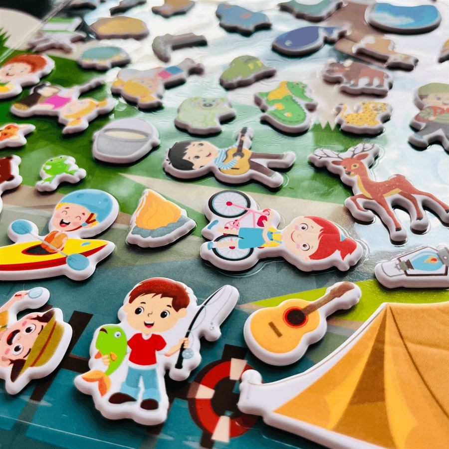 Roztomilá příběhová sada obsahuje oboustranné A3 pozadí se scenériemi se scenériemi mapy světa a chaty u jezera a několik desítek znovu nalepovacích 3D pěnových samolepek.
