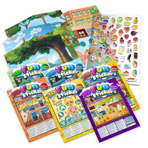 Dopřejte dětem zábavu, která nekončí, a rozvíjejte jejich představivost díky 3D nálepkám – inovativní novince se znovupoužitelnými nálepkami v provedení – Co se děje na ulici, Zábava v kuchyni, Poznej lidské tělo, Veselá farma, Kouzelný les a Veselé safari.