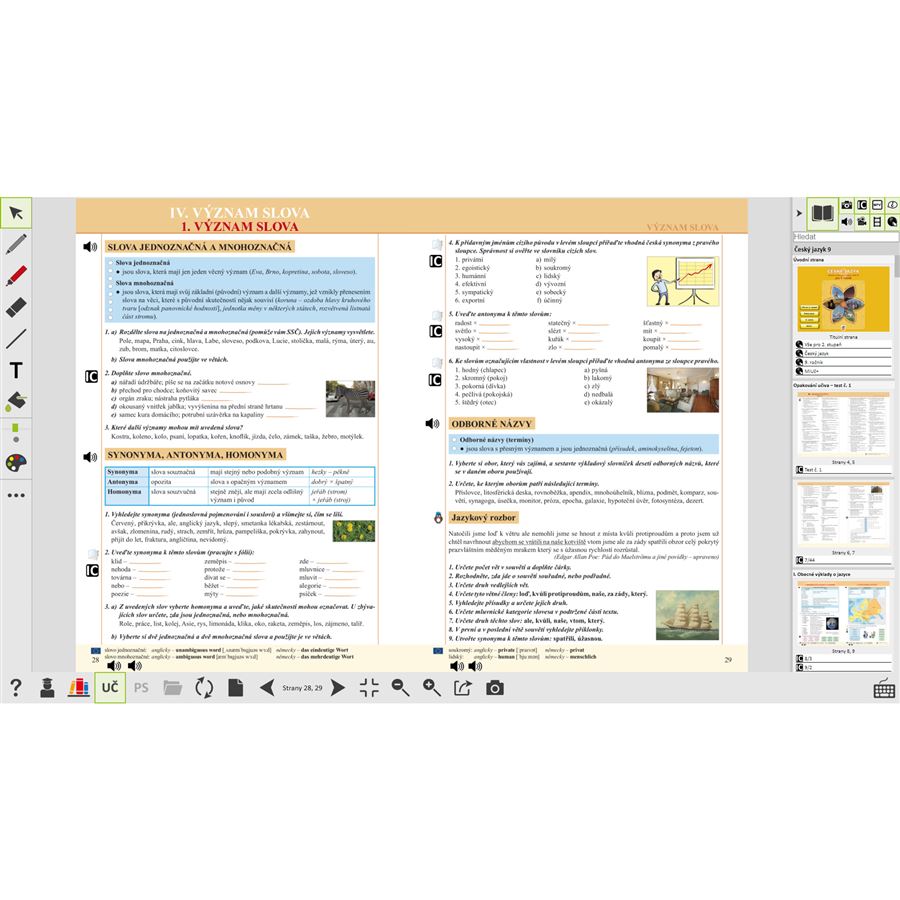 MIUč+ Český jazyk 9 obsahuje interaktivní verzi tištěné učebnice, interkativní cvičení, mezipředmětové vztahy a audia. Vybraná anglická klíčová slova jsou namluvena rodilým mluvčím.