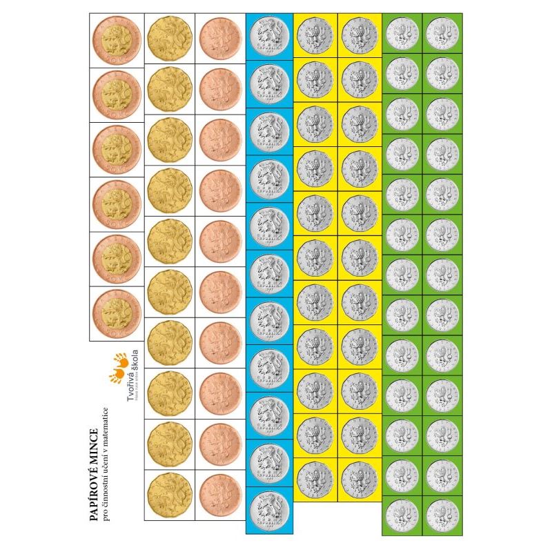 Papírové mince pro činnostní učení v matematice na 1. stupni ZŠ. Pomůcka slouží pro základní postupy při práci s penězi a rozvoj finnančí gramotnosti.