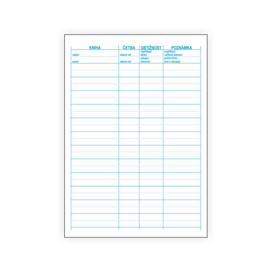 Sešit je určen k zápisu knih a ke tvořivému psaní. Stránky sešitu jsou rozloženy na volné místo určené k ilustraci, lepení textů, obrázků, šablon a z části na psaní s pomocnými linkami pro druhou třídu. Další stránky jsou pro předepsaný zápis knih.