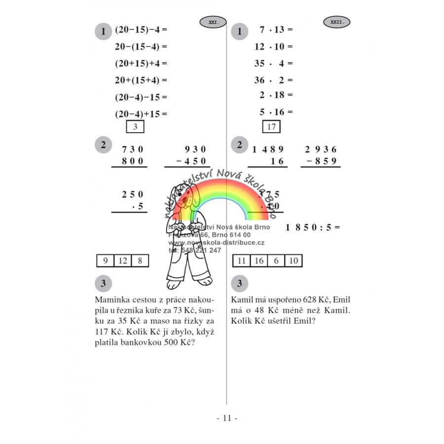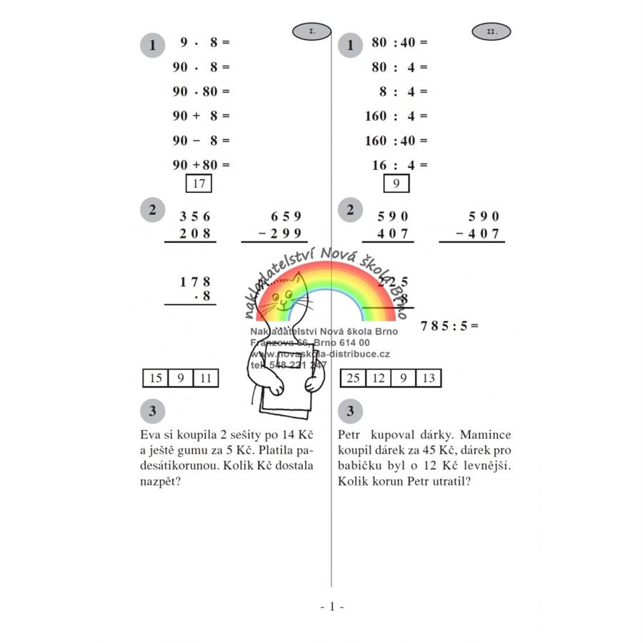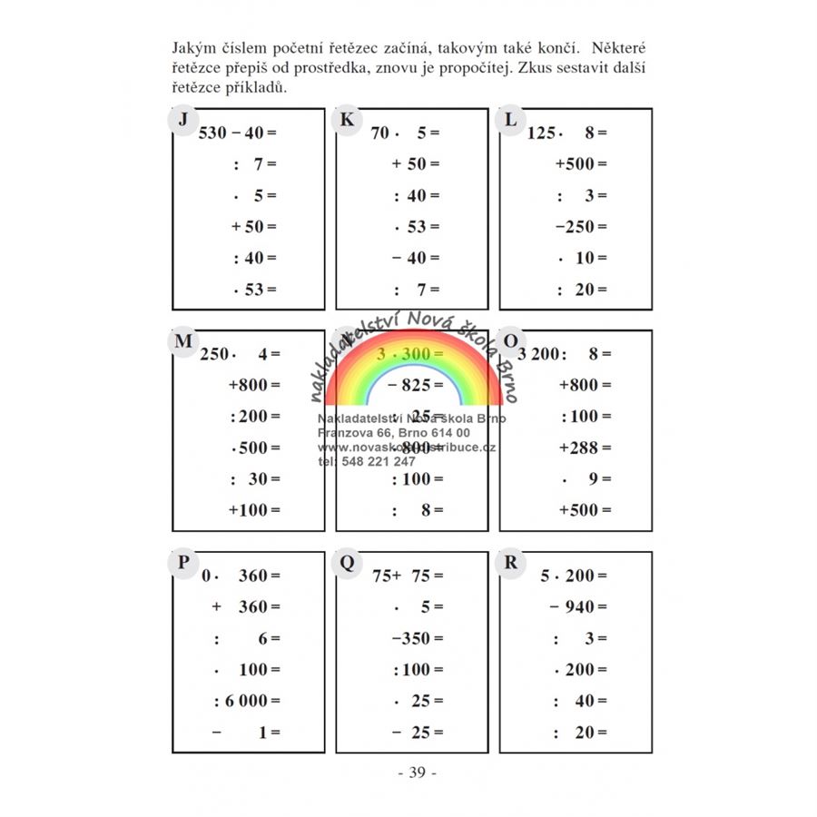 74 početních pětiminutovek zaměřených na procvičení pamětného počítání, písemných algoritmů i úsudkových příkladů.
