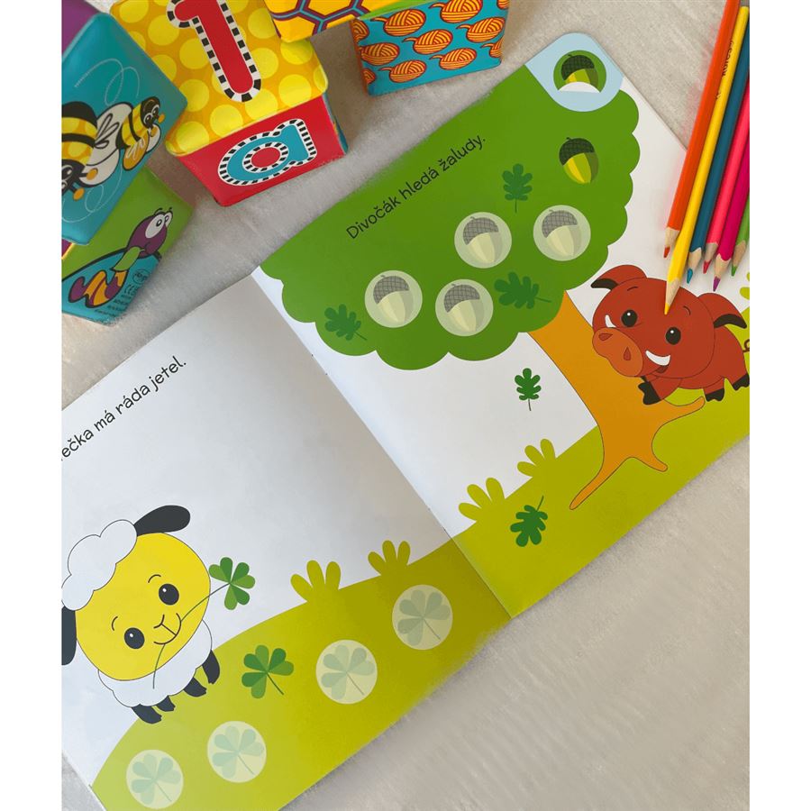 Kniha je určena pro děti od cca 2,5 let, má 16 stran a uprostřed je arch se 40 kulatými samolepkami s obrázky zvířecích pochutin (jetel, mrkev, med, atd.).