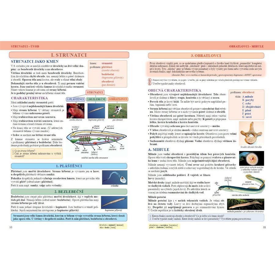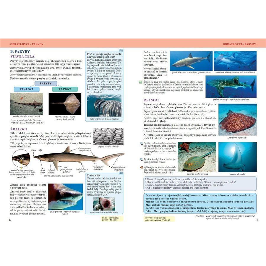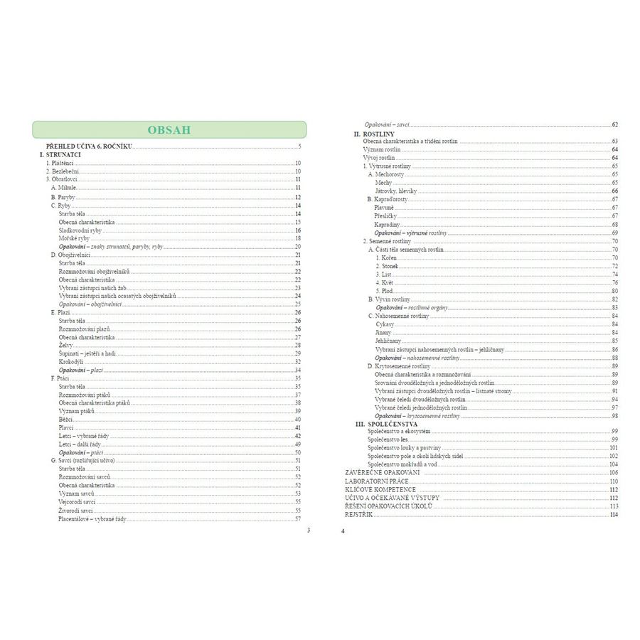 Učebnice je rozdělena na dva hlavní tematické celky – zoologii a botaniku. Hlavní pozornost zoologické části učebnice je zaměřena na obratlovce. Nejprve jsou na konkrétním zástupci prezentovány charakteristické znaky a poté je uvedena obecná charakteristika skupiny. Následuje celkový přehled vybraných zástupců většinou v podobě schématu s barevnými fotografiemi. Hlavní text je doplněn rozšiřujícím učivem v modrých sloupcích na okraji stránky, které nejsou určeny k pamětnému osvojení.
