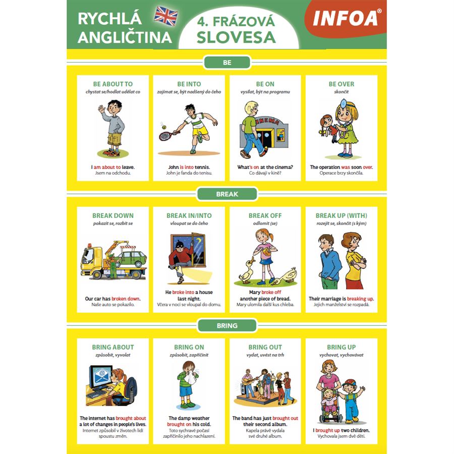 Tato publikace na úrovni A2 - B1 obsahuje přehled základních anglických frázových sloves. Slovesa jsou řazena do přehledných tabulek, ke každému je uveden český význam a příkladová věta s překladem do češtiny. Pro lepší zapamatování je význam slovesa doplněn názornou ilustrací.
