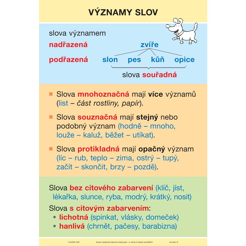 Soubor obsahuje 14 barevných tabulí. List 1–7: Vyjmenovaná slova po b, l, m, p, s, v, z (u každé skupiny také frekventovaná slova, která jsou příbuzná s vyjmenovanými, a dále slova s i/í po obojetné souhlásce, která bývají žáky často mylně pokládána za příbuzná s vyjmenovanými slovy). List 8–14: Co umíme určit u sloves; Slova ohebná; Slova neohebná; Stavba slova; Významy slov; Podstatná jména; Co umíme určit u podstatných jmen