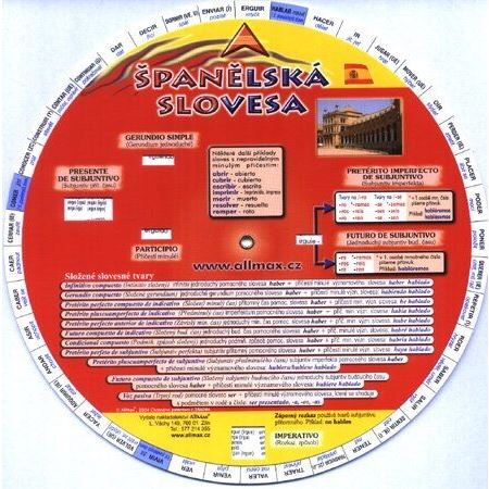 Oboustranné kolečko obsahuje nejpoužívanější španělská nepravidelná slovesa, jenž je možné vyhledávat v jedenácti gramatických časech.