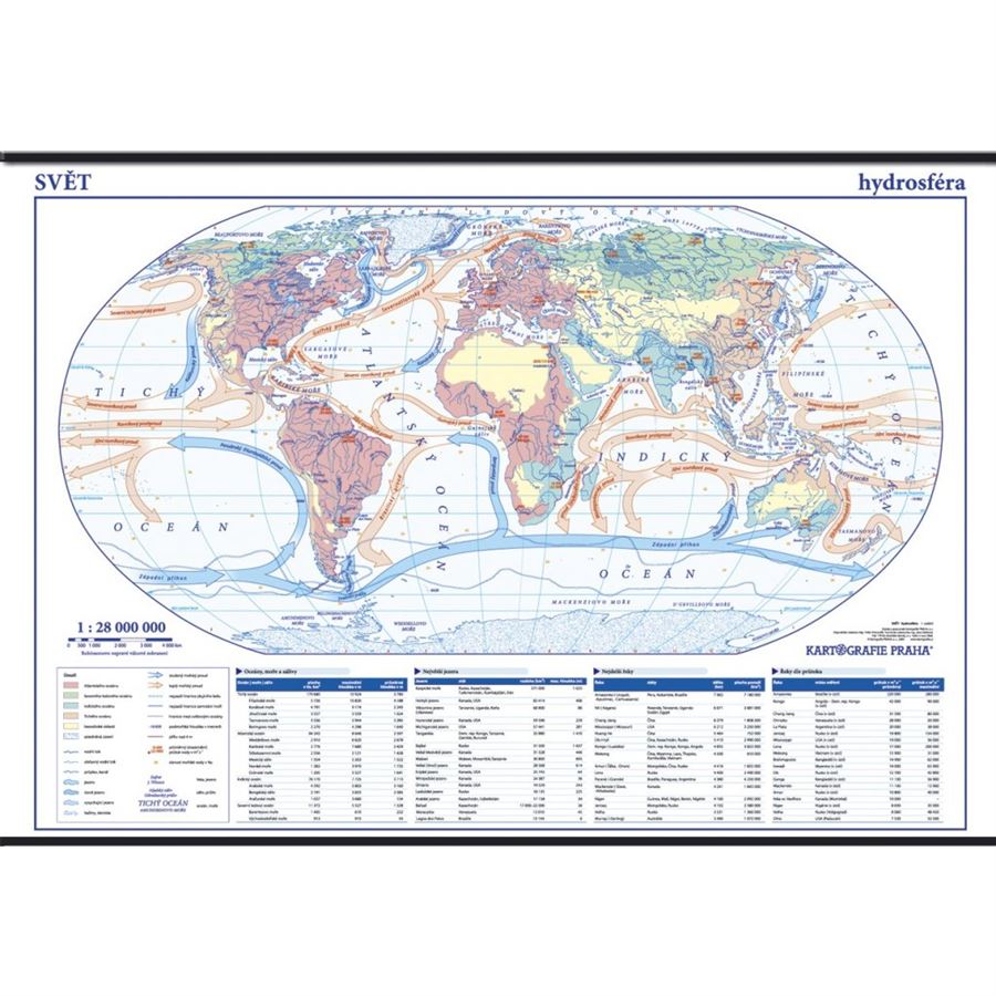 Mapa světové hydrosféry přehledně zobrazuje nejdůležitější vodní toky a plochy světa, vymezuje hlavní světová úmoří a zobrazuje směr a charakter mořských proudů. Tyto základní údaje doplňují informace o slanosti moří a oceánů, místech vysokého přílivu a průměrných a maximálních průtocích hlavních vodních toků a maximálních průtocích hlavních vodních toků.