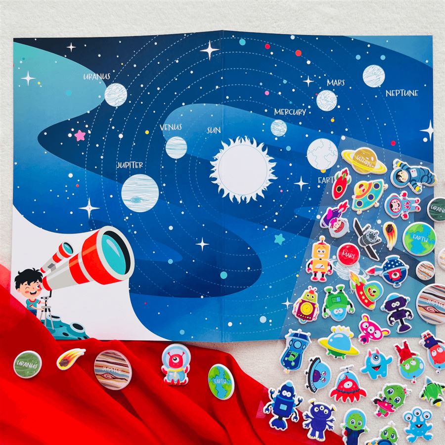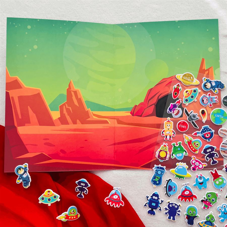 Roztomilá příběhová sada obsahuje oboustranné A3 pozadí se scenériemi se scenériemi sluneční soustavy a měsíční krajiny a několik desítek znovu nalepovacích 3D pěnových samolepek.