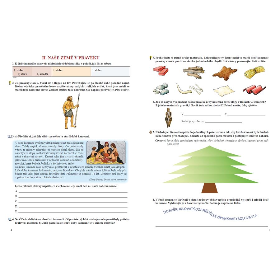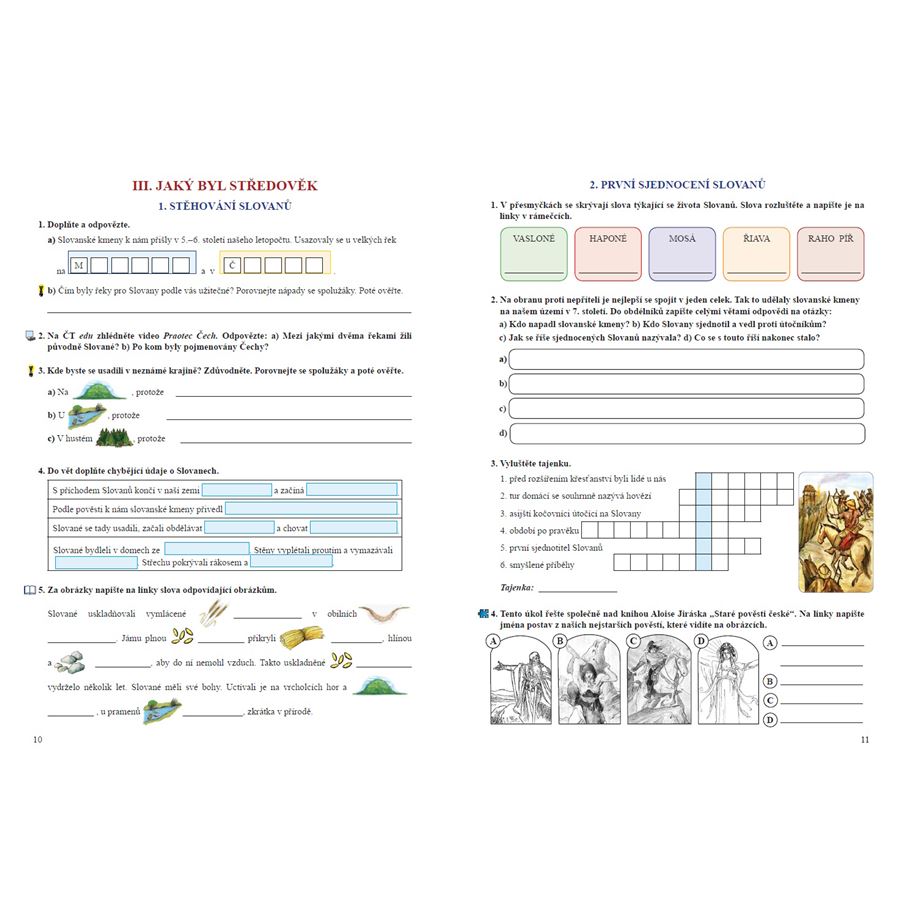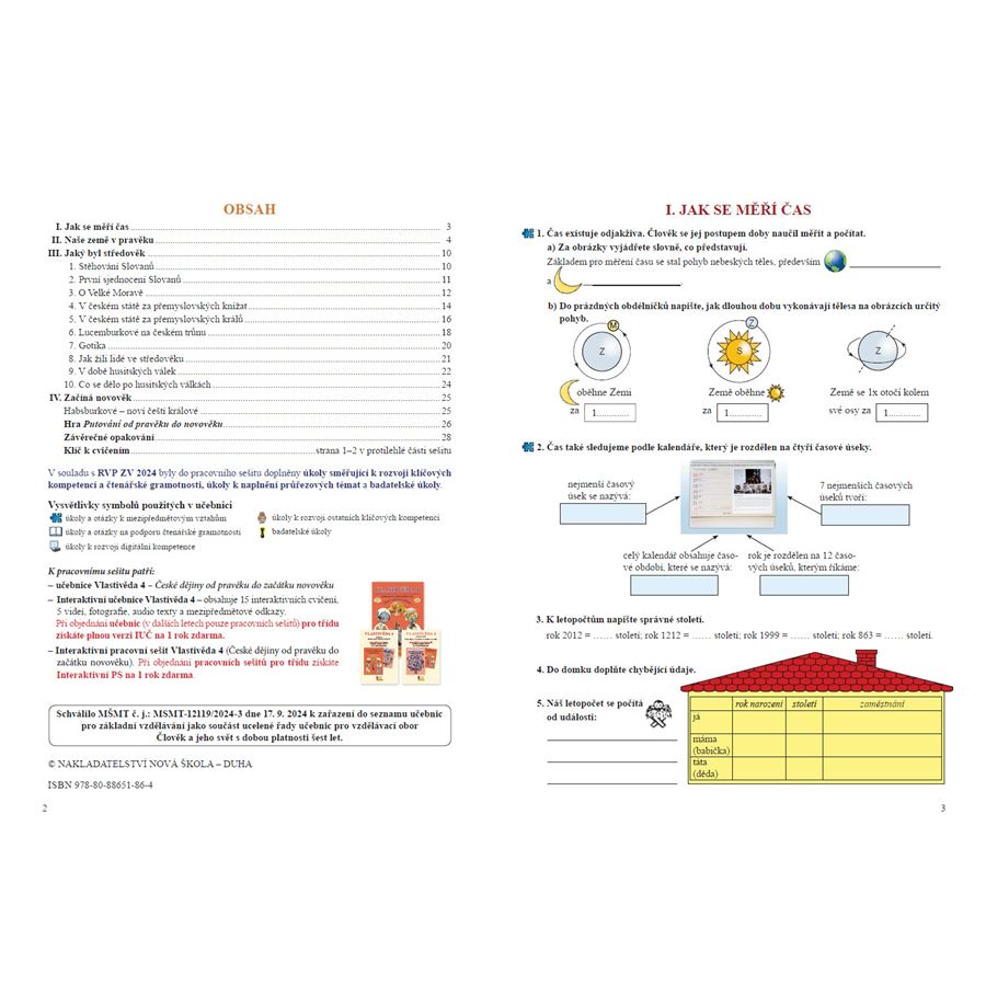 Barevný pracovní sešit je doplňkem učebnice Vlastivěda 4 – České dějiny od pravěku do začátku novověku. Stejně jako učebnice je zpracován v souladu s RVP ZV se zaměřením na zlepšení čtenářské gramotnosti dětí. Pracovní sešit slouží k procvičování a upevnění učiva zábavnou a poutavou formou. Obsahuje rozmanité úkoly ve formě tajenek, rébusů, přesmyček, rozhodování mezi pravdivými a nepravdivými informacemi, doplňování chybějících údajů, úkolů na logické myšlení, spojování roztržených a přeházených částí slov, přiřazování historických událostí apod. Literární ukázky a úkoly vztahující se k textům ukázek napomáhají zlepšit čtenářskou gramotnost dětí a prověří, jak žáci ukázce porozuměli. Nechybí náměty praktických činností a dvě hry. Pracovní sešit je stejně jako učebnice doplněn klíčem, který plně nahrazuje metodické pokyny.