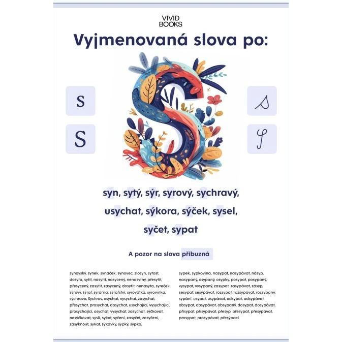Tento barevný a přehledný plakát “Vyjmenovaná slova po S” je ideální pomůckou pro žáky prvního stupně základní školy. Dětem pomáhá snadno si zapamatovat nejen základní vyjmenovaná slova, ale i slova příbuzná. Díky jednoduchému a srozumitelnému designu se stane nepostradatelným pomocníkem při výuce češtiny. Plakát se zaměřuje na klíčová slova jako být, bydlit, obyvatel a mnoho dalších, včetně jejich příbuzných slov.