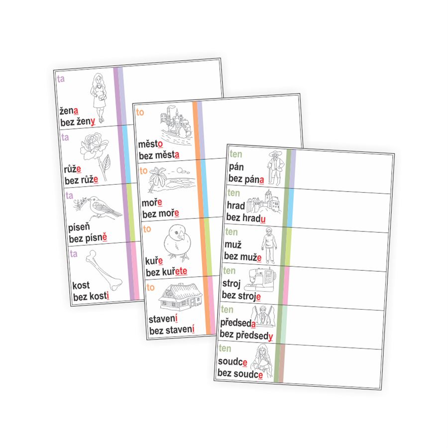 Sada podložek (po 1 kusu podložky vzoru středního, ženského, mužského) pro pomůcku Vzory podstatných jmen.