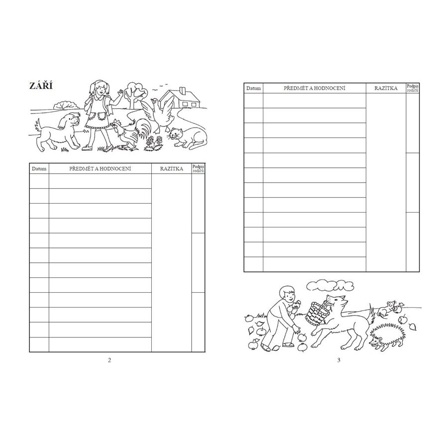 Zápisník je členěn po měsících. Obsahuje kolonky pro hodnocení, pochvalná razítka i podpisy rodičů. Každý měsíc dětem přibližují dva obrázky s tématem činnosti typické pro dané období.