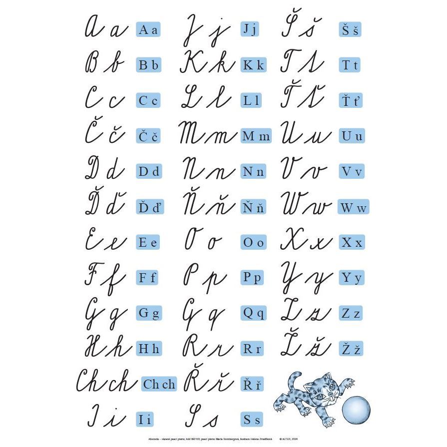 Oboustranná tabule vázaného psacího písma přináší písmena v abecedním pořadí. Na výběr je varianta malého psacího "z" s kličkou nebo s obloučkem.