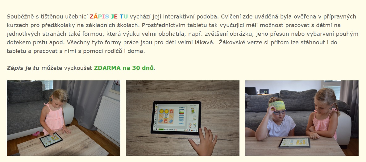 • prostřednictvím tabletu mají předškoláci možnost pracovat s pracovní učebnicí i interaktivně