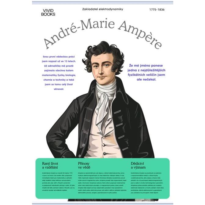Tento plakát představuje Andrého-Marie Ampèra, jednoho z nejvýznamnějších vědců v oblasti elektrodynamiky. Ampère je známý pro svůj objev matematického vztahu mezi elektrickým proudem a magnetickým polem, který vedl k formulaci Ampérova zákona. Na jeho počest byla jednotka elektrického proudu pojmenována jako ampér (A). Ampèrovy objevy zásadně ovlivnily rozvoj moderního elektrického inženýrství a technologie.