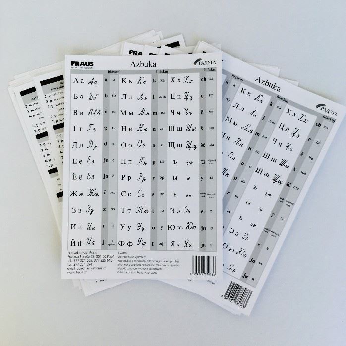 Kartička A5 poslouží jako praktická, názorná učební pomůcka pro ty, kteří začínají se studiem ruského jazyka. Jedna strana zobrazuje tištěnou a psanou formu písmen azbuky, druhá strana je stručným praktickým přehledem základních gramatických jevů.