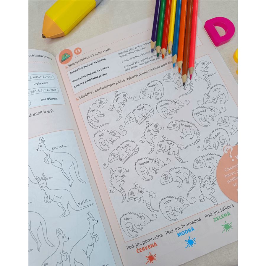 Cvičení se zaměřují na význam a tvoření slov, věty jednoduché a souvětí, psaní i/y ve vyjmenovaných slovech a slovech příbuzných, vzory podstatných jmen aj. Ilustrace jsou sestavené v souladu s učivem přírodovědy ve 4. třídě – Společenstvo lesů, vod, polí, lidských obydlí, a tak je lze také využít v rámci mezipředmětových vztahů.