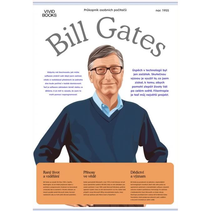 Tento plakát představuje Billa Gatese, zakladatele společnosti Microsoft a jednoho z nejvlivnějších technologických inovátorů všech dob. Gates zásadně přispěl k rozvoji osobních počítačů a operačního systému Windows, který dnes používá celý svět. Po odchodu z Microsoftu se Gates zaměřil na filantropii, kde prostřednictvím nadace Bill & Melinda Gates Foundation usiluje o zlepšení života lidí po celém světě.