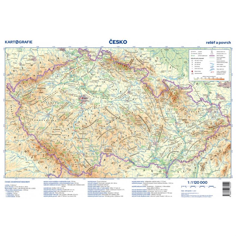 Získáte díky ní přehled o všech důležitých nížinách, pahorkatinách i horstvech, významných vrcholech, stejně jako o husté říční síti a všech větších vodních plochách. Mapa reliéfu a povrchu obsahuje navíc všechny národní parky a CHKO na území Česka a vybrané přírodní zajímavosti.