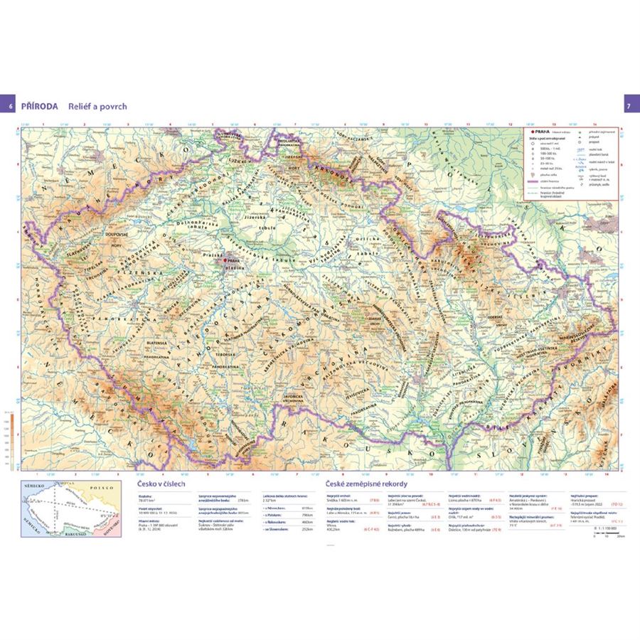 Šesté vydání oblíbeného školního atlasu Česka v upravené grafické podobě nabízí kromě nepostradatelných obecně zeměpisných a politických map řadu tematických map, založených na nejnovějších statistických údajích.