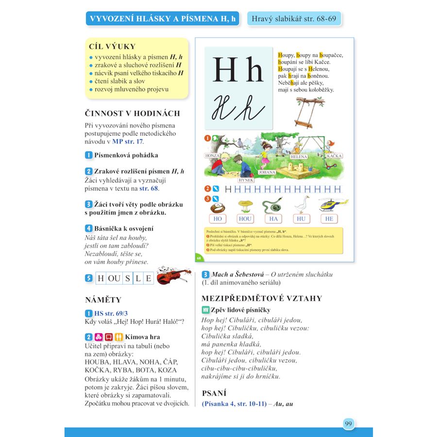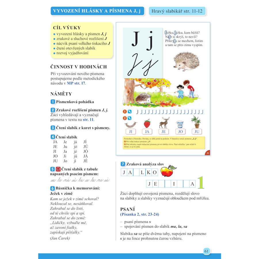 Obsahuje metodické návody práce v hodinách (vyvození nového písmena, čtení otevřené slabiky, čtení zavřené slabiky, práce s literárním textem, nácvik psaní vybraných prvků písmen).