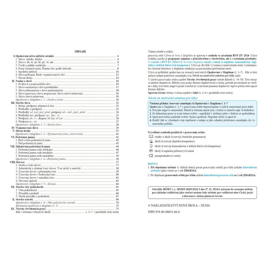 racovní sešit Učíme se hrou s Magikem je upraven v souladu se zásadami RVP ZV 2024. Učivo českého jazyka je propojeno zejména s přírodovědou a vlastivědou, ale i s ostatními předměty.