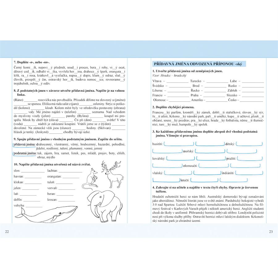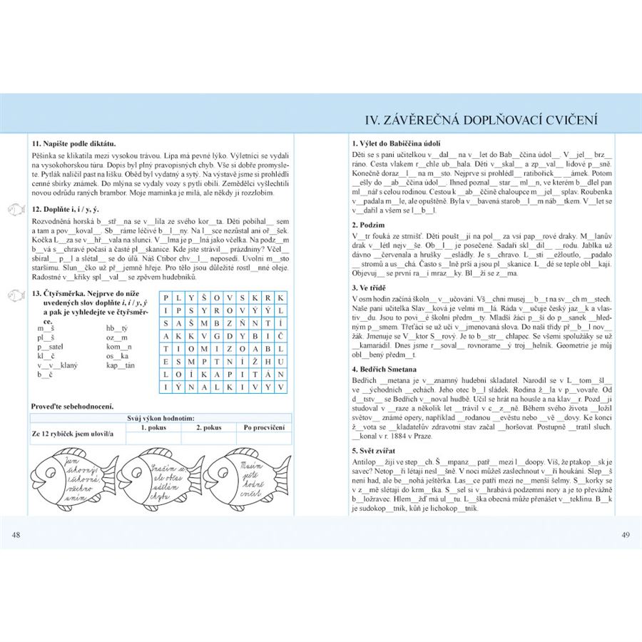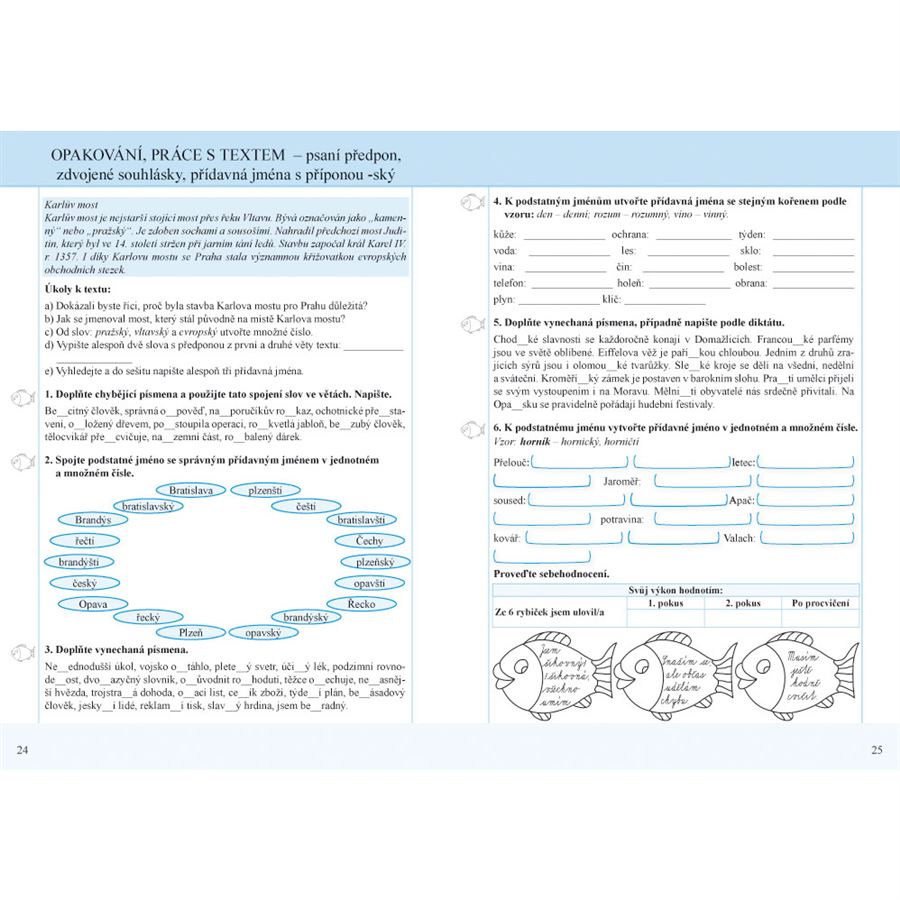 V úvodu jednotlivých kapitol jsou pro žáky připraveny práce s textem se zajímavými úkoly. Pracovní sešity jsou doplněny o sebehodnocení žáků, které je zpracováno hravou formou. A navíc mají pracovní sešity větší formát. Pracovní sešit Český jazyk 5 nově, 1. díl obsahuje: Opakování učiva nižších ročníků, Slovo, stavba slova a tvoření slov (části slova, příbuzná slova, tvoření slov, zdvojené souhlásky, předpony s-, se-, z-, ze-, vz-, vze-, souhláskové skupiny bě/bje, vě/vje, pě, mě/mně, pravopis i, í/y, ý po obojetných souhláskách, Závěrečné opakování, Závěrečná doplňovací cvičení, Čtvrtletní práce a Klíč s řešením.