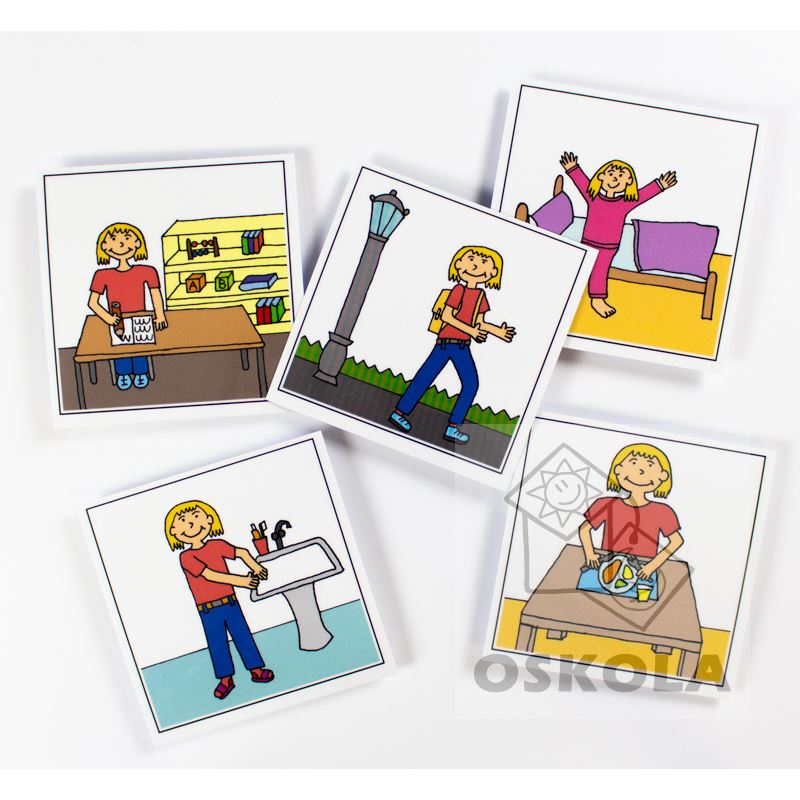 Jedná se o soubor 12-ti kartiček, na kterých je zobrazeno, co dělá dívka po celý den.