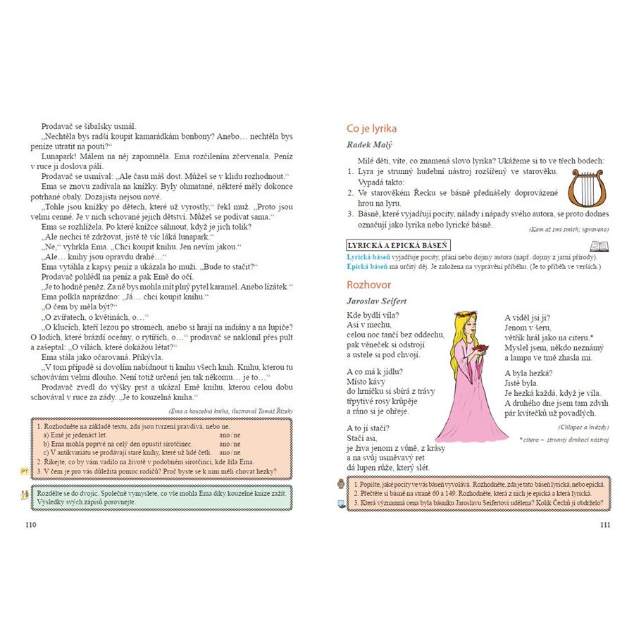 Každá literární ukázka je doplněna otázkami a úkoly směřujícími k rozvoji čtenářské gramotnosti dětí.