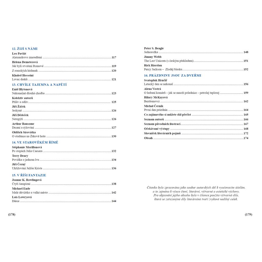 Tato čítanka byla sestavena pro potřeby výuky v souladu s RVP ZV 2023. Ukázky byly vybrány tak, aby bylo možno v co největší míře uplatnit mezipředmětové formy výuky. Nechybí řada činnostních úkolů a námětů pro skupinovou práci.