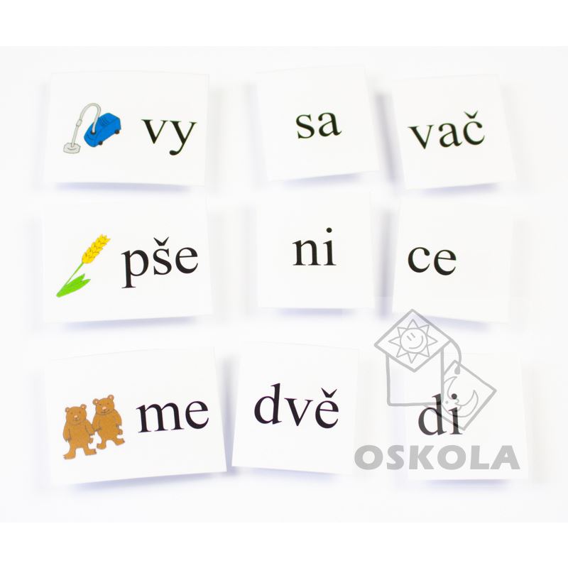 Sada obsahuje 20 trojic kartiček. Pomocí kartiček lze složit a přečíst jednoduchá trojslabičná slova skládající se z jedné uzavřené a dvou otevřených slabik.