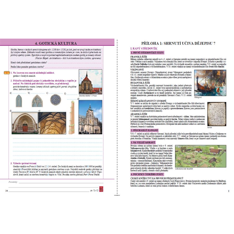 Uprostřed sešitu najdete čtyři PŘÍLOHY: shrnutí učiva tohoto ročníku, slepé mapy s úkoly, časovou osu a přehled dějin středověku.