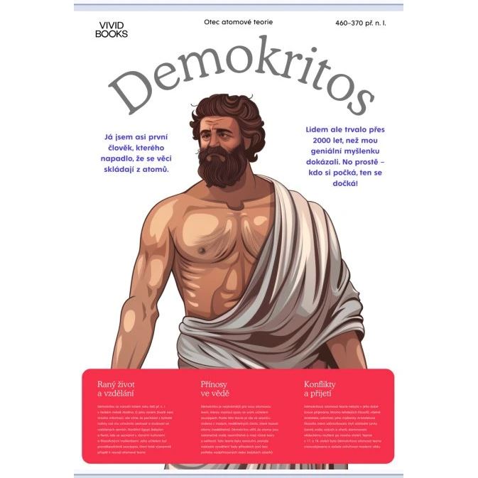 Tento plakát představuje Démokrita, jednoho z nejvýznamnějších antických filozofů, který jako první rozvinul myšlenku atomové teorie. Démokritos věřil, že všechno kolem nás je složeno z malých, nedělitelných částic – atomů. I když jeho teorie nebyla ve své době široce přijímána, o více než 2000 let později se stala základem moderní vědy a chemie.