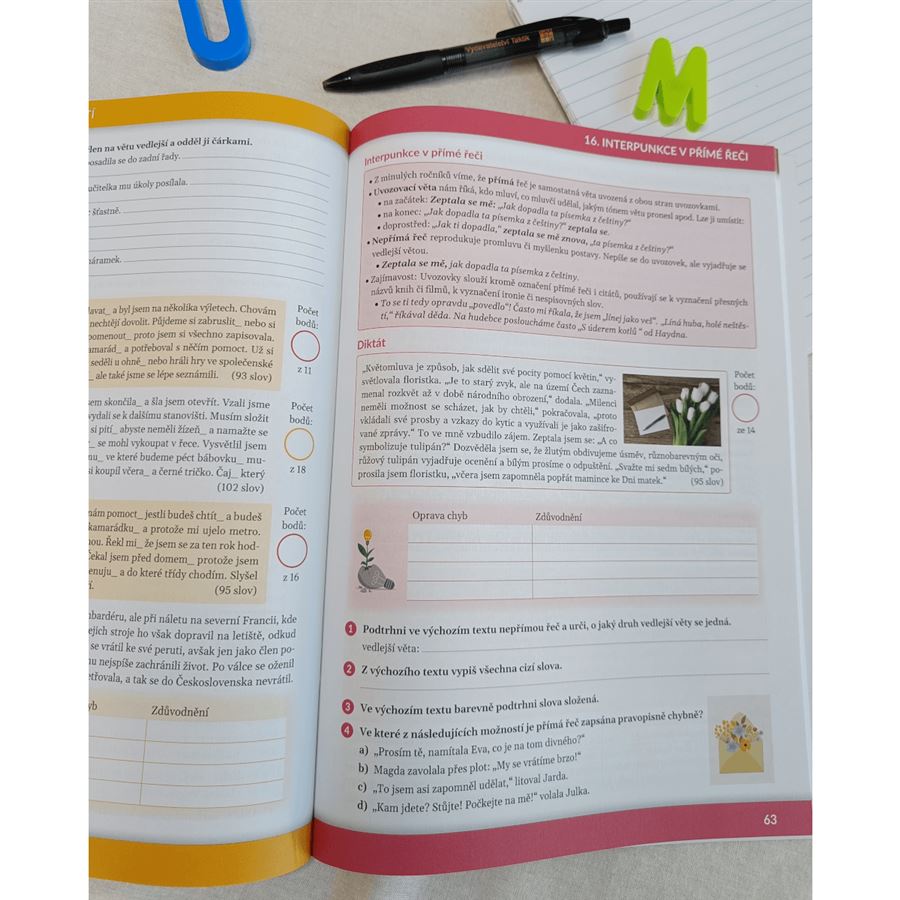 Publikace nabízí prostor pro sebehodnocení, opravu i sledování vlastního pokroku. Zajímavá a různorodá témata diktátů rozvíjejí všeobecný přehled žáků a mezipředmětové vazby. Vedle klasických diktátů a doplňovacích cvičení publikace obsahuje i tvořivé úlohy a cvičení, která se zaměřují na přípravu k přijímacím zkouškám na SŠ.